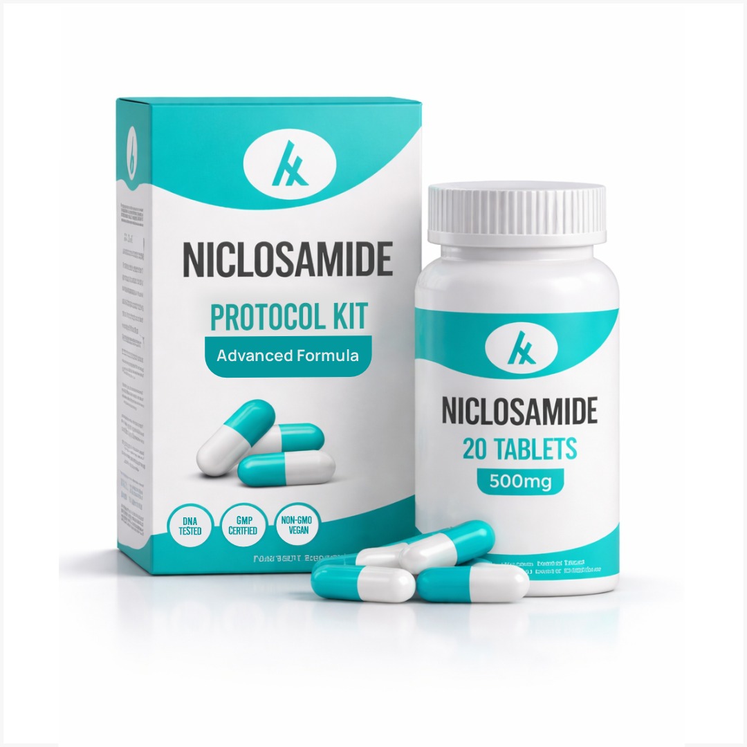 Niclosamide 500mg tablets are packaged in a secure 20-count bottle designed for controlled and directed use. Each tablet contains 500mg of niclosamide and is manufactured under quality-controlled standards to ensure consistency and product integrity.